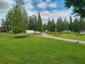 Leirintäalueen nykyaikainen huoltorakennus ja vihertävä nurmikenttä sekä leikkikenttä mahdollistavat viihtyisän lomailun.